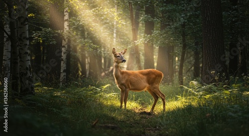 © Timur, Fototapeta premium Majestic deer illuminated by sunlight in a forest