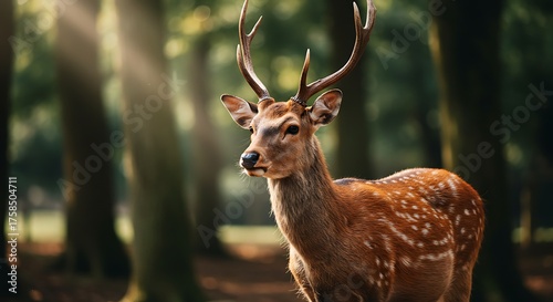 Naklejka premium Majestic deer in a forest with sunlight streaming through trees