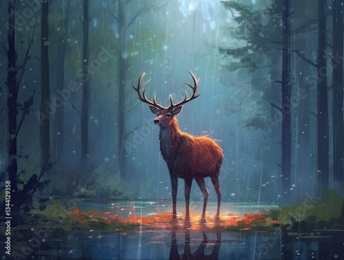 © isti, Fototapeta premium Majestic deer in a rainy forest glade