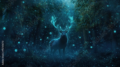 © Narongsag, Fototapeta premium Majestic Deer in Enchanted Forest with Glowing Lights