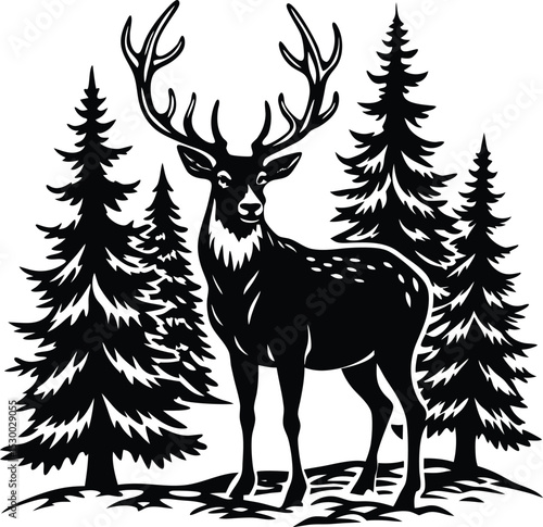 Fototapeta premium Majestic Deer in Pine Forest A Striking Black and White Illustration