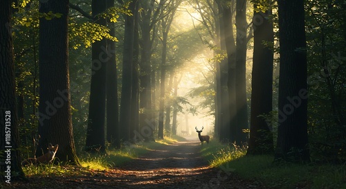 © Sandal, Naklejka premium Majestic Deer in Sunlit Forest Path Magical Sunrise Nature Photography