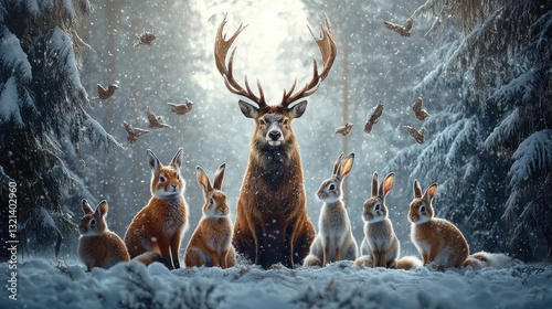 Fototapeta premium Majestic Deer Rabbits Winter Wonderland Snowy Forest Scene