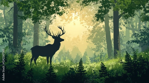 © Almahyra, Fototapeta premium Majestic deer silhouetted in a sunlit forest clearing.