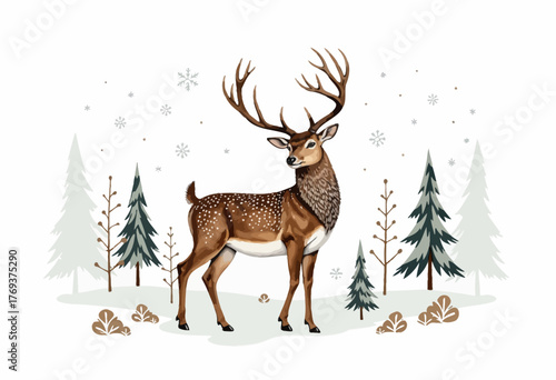 Obraz premium Majestic Deer Standing Gracefully in a Serene Winter Forest Scene with Snowflakes and Evergreen Trees in a Harmonious Nature Illustration