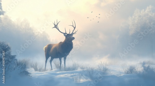 Fototapeta premium Majestic deer standing in a snowy meadow with a soft, foggy background