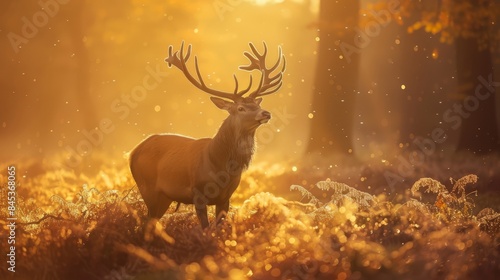 Fototapeta premium Majestic deer standing in a sunlit forest. Autumn leaves glow in golden...