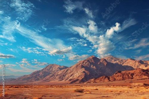 Naklejka premium Majestic desert landscape featuring rugged mountains under a vibrant sky with varied clouds, dry grass and shrubs in the foreground showcasing the harsh climate and warm earthy tones