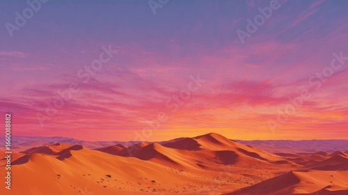© Tiwakeat, Naklejka premium Majestic desert panorama displaying expansive orange dunes against a stunning pink and purple sky
