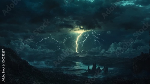 © Jakkarin, Obraz premium Majestic Distant Thunderstorm: Illuminated Landscape with Lightning Flashes