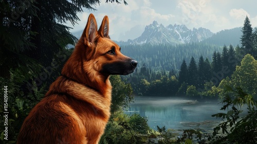© warunthorn, Naklejka premium Majestic Dog in Serene Natural Landscape with Mountains and Lake