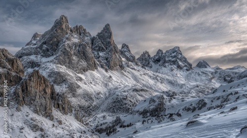 Obraz premium Majestic Dolomite Mountain Range Peaks Covered in Fresh Snow Under a Dramatic Cloudy Sky, Winter Landscape