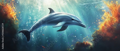 © Puchong, Fototapeta premium Majestic dolphin gracefully swims through sunlit ocean waters, surrounded by vibrant coral and schools of fish. A breathtaking underwater scene.