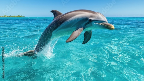 © isend, Naklejka premium Majestic dolphin leaping gracefully through turquoise ocean waters.