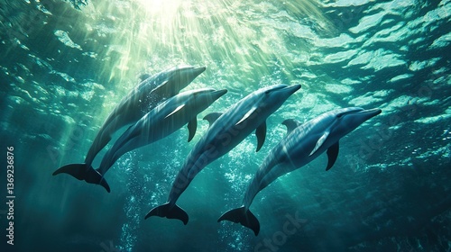 Obraz premium Majestic dolphins dance beneath sunlit ocean surface in shimmering aquatic...