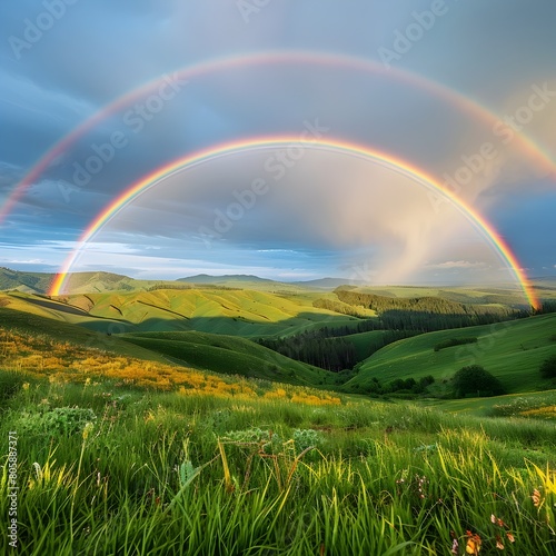 Naklejka premium Majestic Double Rainbow Arches Over Lush Green Valley After Spring Shower