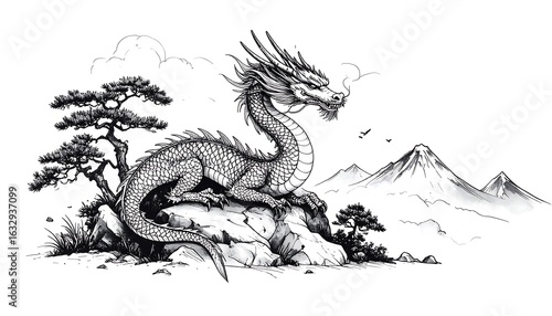 © Lokar, Obraz premium Majestic dragon resting on a rock, with a serene landscape behind