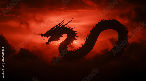© Chantanapa, Obraz premium Majestic Dragon Silhouette against Fiery Red Sky with Clouds