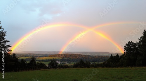 Naklejka premium Majestic Dual Rainbow Arcing Over Lush Green Landscape with Rolling Hills and Trees During Dramatic Evening Sky After Rain Storm
