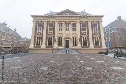 Obraz premium Majestic Dutch Parliament buiding. and Mauritshuis entrance under a misty and foggy weather with nobody listed as RF like the picture 1213013458