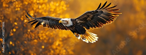 © MDNORUL, Obraz premium Majestic Eagle in Flight Against Golden Sunset Forest Backdrop