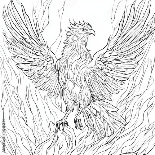 © Andrew, Naklejka premium Majestic Eagle in Flight: Line art drawing of a powerful eagle taking flight from a rocky terrain, wings outstretched in a dynamic pose. Perfect for coloring books, fantasy art.