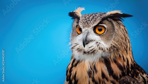 © netsay, Fototapeta premium Majestic Eagle Owl Perched Against a Vibrant Blue Backdrop, Showcasing Striking Detail and Captivating Beauty in an Artistic Portrait.