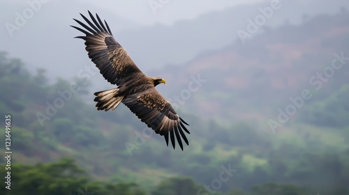 © warunthorn, Fototapeta premium Majestic Eagle Soaring Above Lush Green Mountains in Nature's Glory