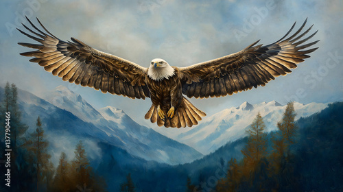 © Carry, Obraz premium Majestic Eagle Soaring Above Mountains
