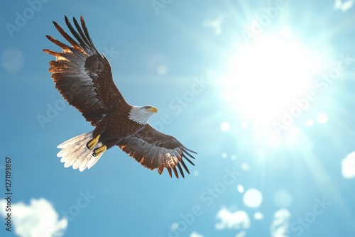 Obraz premium Majestic Eagle Soaring Against Bright Sunlit Sky in Clear Blue Background