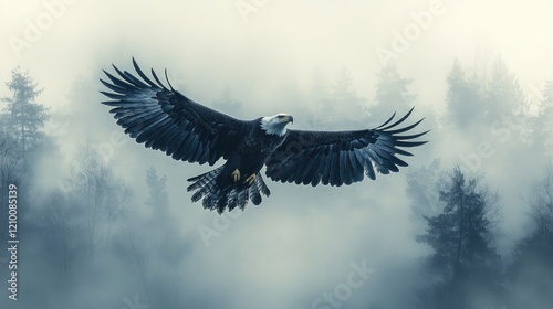Naklejka premium Majestic eagle soaring, foggy forest, freedom, nature print