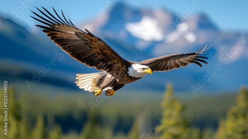 © tuiphotoengineer, Fototapeta premium Majestic eagle soaring gracefully over the towering peaks of a rugged mountain landscape on a clear serene day Powerful bird of prey in flight