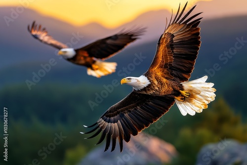 © Thanyarat, Obraz premium Majestic eagle soaring high over a mountain range at dawn