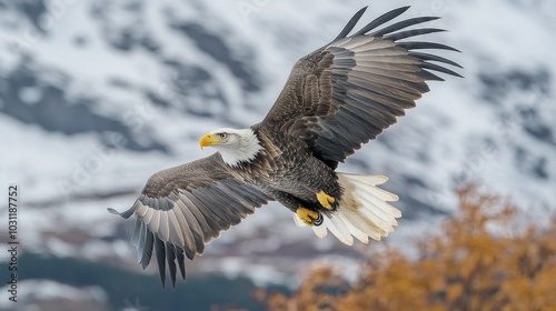 Fototapeta premium Majestic eagle soaring over a snowy landscape.