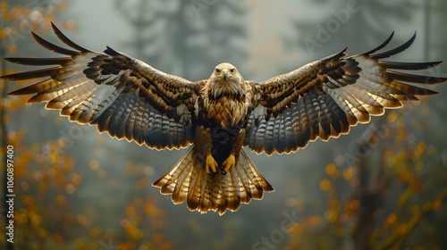Obraz premium Majestic Eagle Soaring Over Lush Forest Landscape in Nature Documentary...