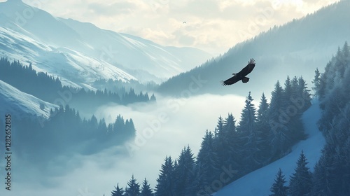 Naklejka premium Majestic Eagle Soaring Over Misty Winter Mountains