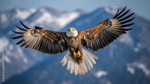 Naklejka premium Majestic eagle soaring over mountainous landscape with wings fully extended...