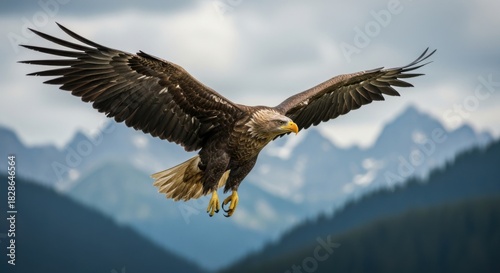 Fototapeta premium Majestic Eagle Soaring Over Mountains with Wings Spread