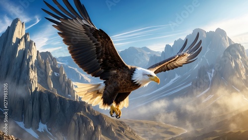 © fotofabrika, Obraz premium Majestic eagle soaring over rugged mountain landscape at sunset with vibrant sky and dramatic peaks