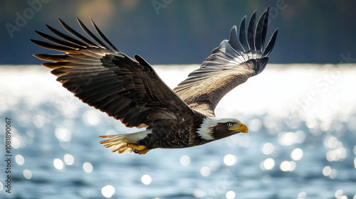 Fototapeta premium Majestic eagle soaring over shimmering water, showcasing its powerful wings and keen gaze. sunlight creates beautiful lens flare, enhancing serene atmosphere