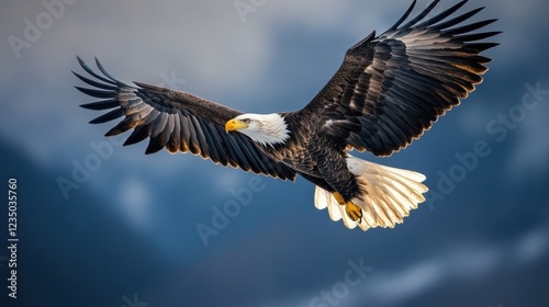 Fototapeta premium Majestic eagle soaring through a scenic backdrop at dusk revealing nature's beauty in flight