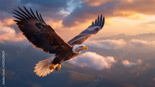 Obraz premium Majestic eagle soaring through a vibrant sunset sky, with mountains and...
