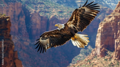 Fototapeta premium Majestic eagle soars gracefully through the canyon with open wings