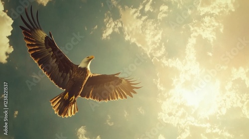 Obraz premium Majestic eagle soars through the sky during a bright sunset, displaying its...