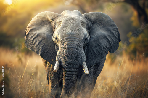 Naklejka premium Majestic elephant in golden savannah, captured in stunning detail with an intense gaze, highlighting the beauty and strength of wildlife. Animals.