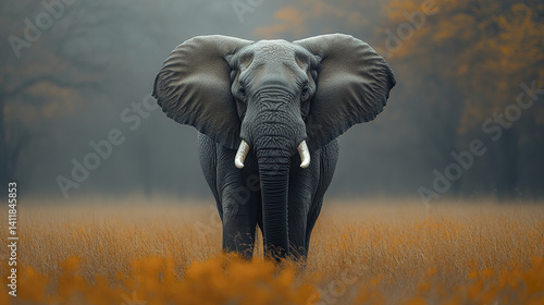 Naklejka premium Majestic elephant standing in misty field with autumn foliage