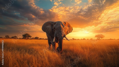© CHAKKAPONG, Naklejka premium Majestic elephant walking through a savannah at sunset, high quality