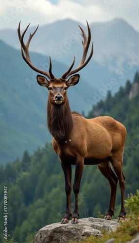 © Viktor, Naklejka premium Majestic elk with antlers stands on mountain ridge. Wild deer is animal with brown fur, looking at camera. Green forest background in scenery landscape with mountains.