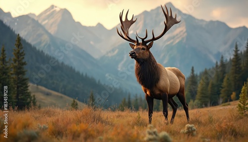 © Vadym, Obraz premium Majestic elk with large antlers stands in a dry grass meadow. Mountains and pine trees form a scenic backdrop under a soft sky. Wild animal in natural habitat.