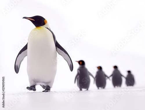 Fototapeta premium Majestic emperor penguin leading a group of adorable penguin chicks on a snowy landscape in Antarctica under a bright white sky